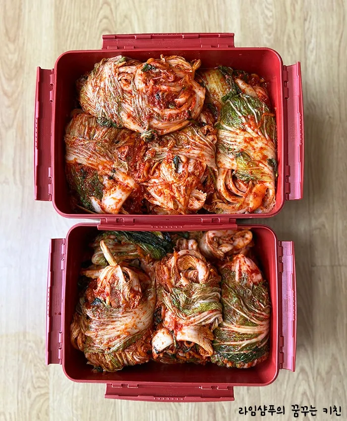 저는 5kg 용량 플라스틱 김치통 4개를 쓰는데, 하나씩 꺼내 먹으니까 나머지는 깨끗하게 보관되어 좋더라고요.