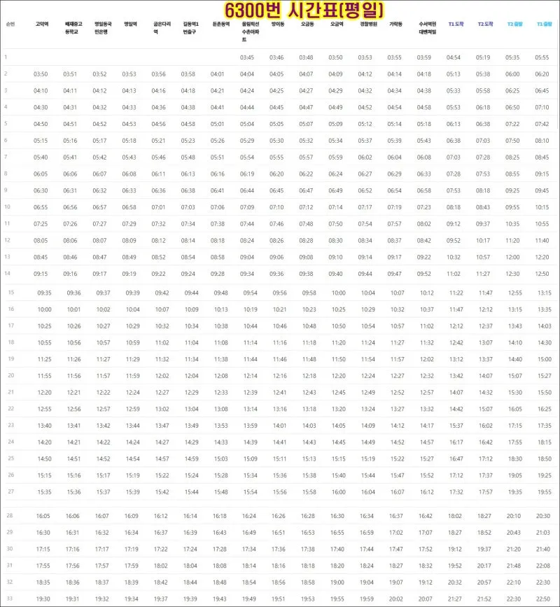 평일이든 주말이든 6300 공항버스 시간표는 동일하게 운행돼요. 명절이나 연휴에도 똑같은 시간표로 다니니까 걱정 안 하셔도 됩니다.